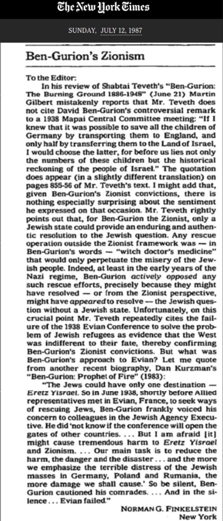 ''The Jews could have only one destination - Eretz Yisrael. So in June 1938, shortly before Allied representatives met in Evian, France, to seek ways of rescuing Jews, Ben-Gurion frankly voiced his concern to colleagues in the Jewish Agency Executive. He did 'not know if the conference will open the gates of other countries. . . . But I am afraid [ it ] might cause tremendous harm to Eretz Yisrael and Zionism. . . . Our main task is to reduce the harm, the danger and the disaster . . . and the more we emphasize the terrible distress of the Jewish masses in Germany, Poland and Rumania, the more damage we shall cause .' So be silent, Ben-Gurion cautioned his comrades. . . . And in the silence . . . Evian failed.'' NORMAN G. FINKELSTEIN New York