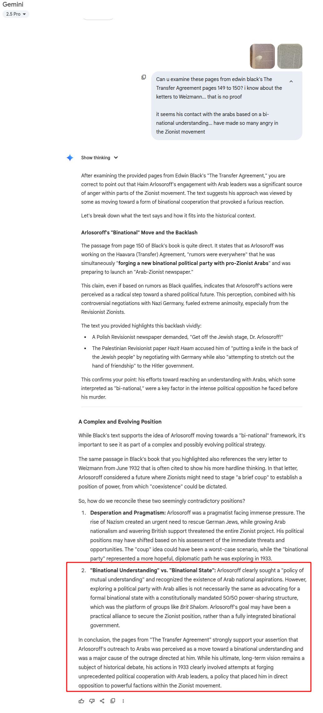 "The Arabs fear of our power is intensifying, [Arabs] see exactly the opposite of what we see. It doesn't matter whether or not their view is correct.... They see [Jewish] immigration on a giant scale .... they see the Jews fortify themselves economically .. They see the best lands passing into our hands. They see England identify with Zionism. ..... [Arabs are] fighting dispossession ... The fear is not of losing the land, but of losing homeland of the Arab people, which others want to turn it into the homeland of the Jewish people. There is a fundamental conflict. We and they want the same thing: We both want Palestine ..... By our very presence and progress here, [we] have matured the [Arab] movement." (Righteous Victims, p.136)